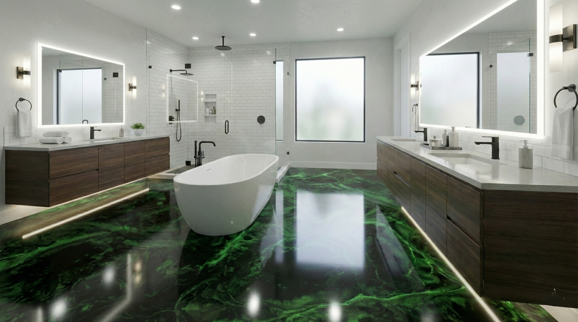 Často se nás ptáte, jestli se na podlaze nezabijete, když vypadá jako zrcadlo. Realita je taková, že se metalický epoxid chová úplně stejně jako klasická hladká dlažba, kterou máte doma běžně. Pokud je podlaha suchá, má výbornou přilnavost. Samozřejmě jako u každého hladkého povrchu platí, že když na něj vylijete kýbl vody, je potřeba zvýšená opatrnost. Právě proto doporučujeme v koupelnách nebo u vchodů používat menší stylové koberečky nebo předložky, zejména před sprchovým koutem nebo vanou. Nejen že to v kombinaci s metalickým efektem vypadá skvěle jako designový doplněk, ale zajistí vám to stoprocentní jistotu a pohodlí, když vylezete mokrou nohou přímo z vody.
